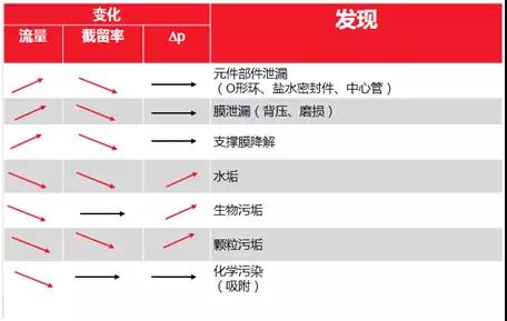 毫無疑問,調(diào)查過程取決于所發(fā)現(xiàn)的問題。如果透鹽率上升,即脫鹽率下降,則表明膜或元件可能出現(xiàn)化學或機械損壞。另一方面,滲透流量減少通常是由于有機、生物或無機污垢所致。下表概述了過濾性能降低的趨勢和潛在原因。