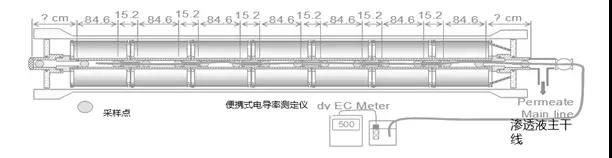 如流量增加而脫鹽率下降,在任何測量值顯著升高的情況下,應檢查所有膜殼的產(chǎn)水電導率。針對有明顯問題的任何一根管道,可以采用“中心管測試方法”來識別哪支膜元件。具體測試包括將軟管伸入螺旋卷繞元件的中心管,一直到壓力管的末端,然后慢慢地將其拉出,獲取軟管中的部分滲透液。然后對樣品的電導率進行測試。如果某一點的值突然升高,可根據(jù)已經(jīng)拉出的軟管長度來確定泄漏的位置。