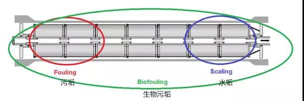 有機污垢主要導致上游側(cè)管道堵塞,而如果下游側(cè)鹽含量較高,可能導致鹽沉淀,即無機污垢或水垢。生物污垢可以擴散到整個系統(tǒng),因此可存在于各個點。